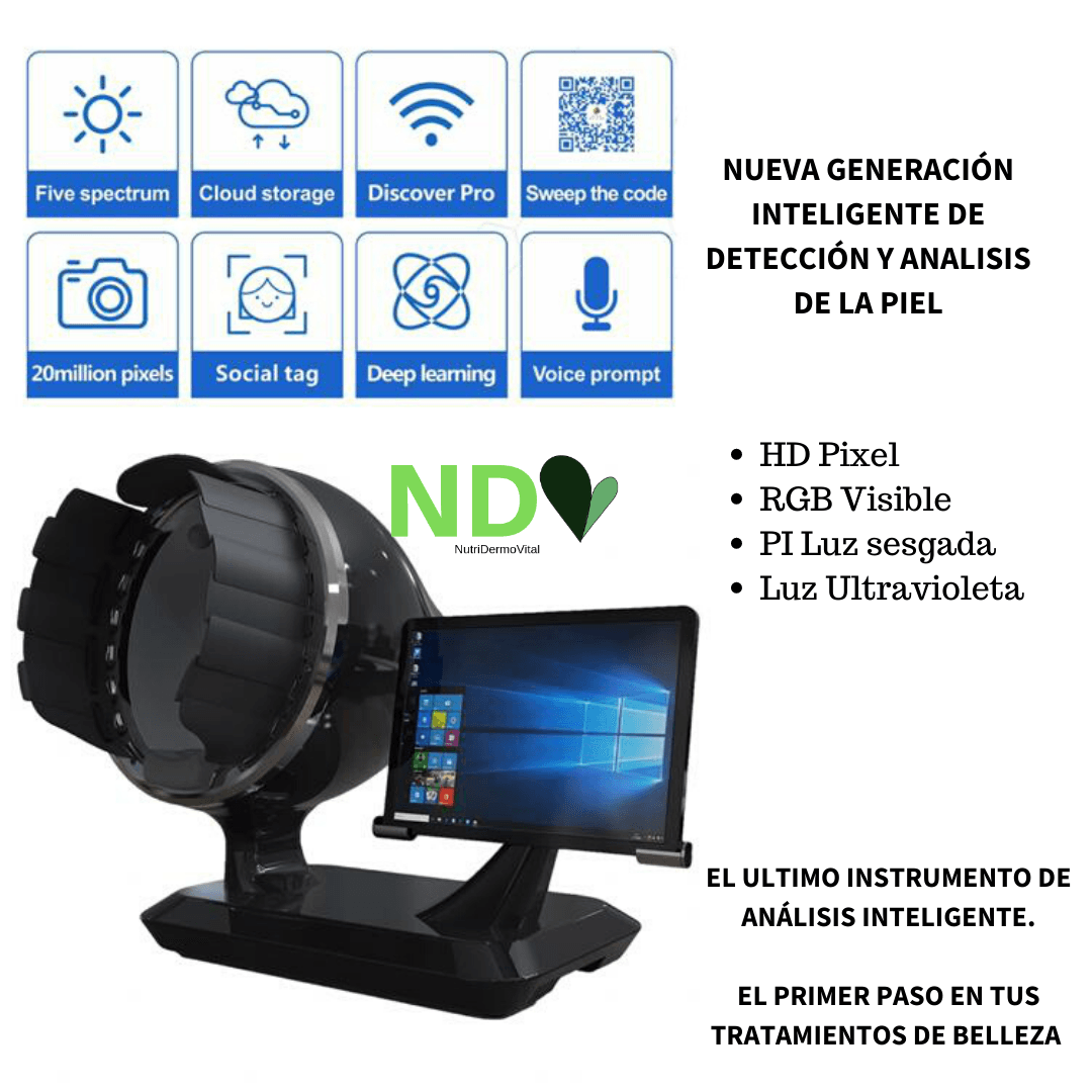 Our NDV CPU SKIN ANALYZER is a professional facial skin analysis device, which adopts RGB and UV light sources, with spectral imaging technology to help us detect 9 skin problems, superficial and deep. It is an effective and necessary instrument for beauty salons, skin clinics and the perfect tool for cosmetic companies.An indispensable device to select the correct treatment in each case.