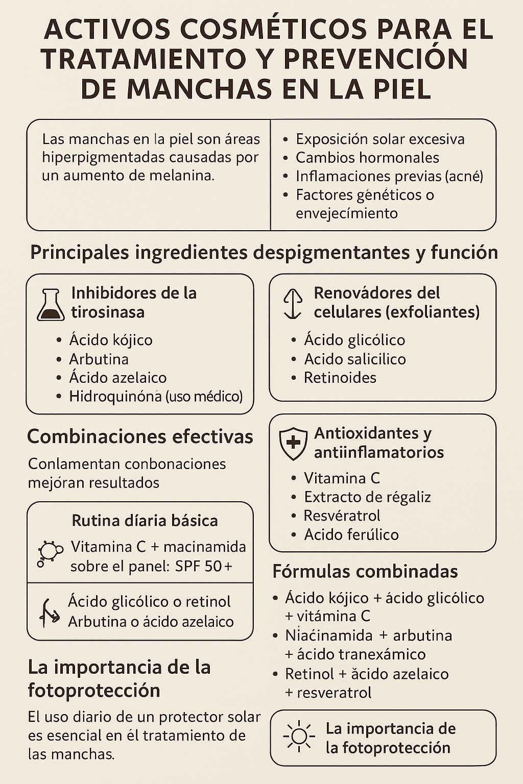 Las hiperpigmentaciones cutáneas, como el melasma, las manchas solares (lentigos) y las postinflamatorias, representan una de las principales preocupaciones estéticas en la consulta dermatológica y estética. Este artículo tiene como objetivo presentar, de forma clara y pedagógica, los principales ingredientes activos utilizados para prevenir y tratar las manchas, así como las combinaciones más efectivas según la evidencia científica.