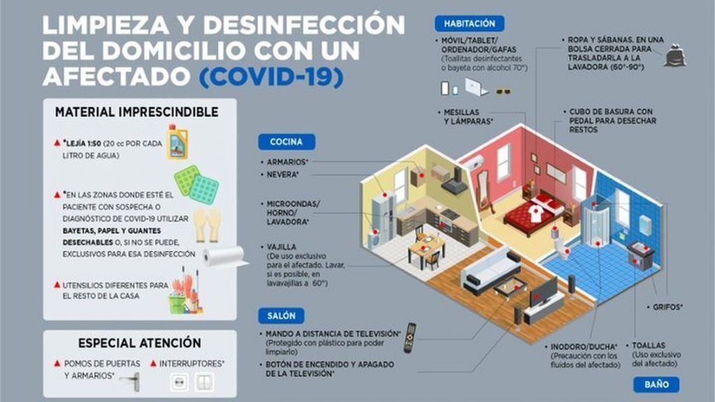 Se deberá desinfectar con mayor atención: los pomos de las puertas y armarios, interruptores, mesillas y lámparas, inodoro, ducha, grifos, mando a distancia, televisión y electrodomésticos. Determinados objetos como las toallas, las sábanas, el móvil, ordenador o la vajilla necesitan un tratamiento especial en el momento de la desinfección.