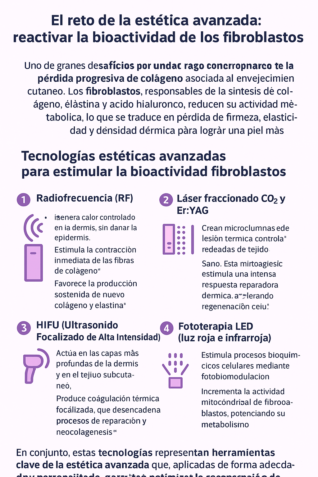 El objetivo principal de muchas tecnologías estéticas actuales es estimular de manera controlada la bioactividad de los fibroblastos, favoreciendo la neocolagénesis (formación de nuevo colágeno) y la remodelación dérmica para lograr una piel más firme, tersa y rejuvenecida.