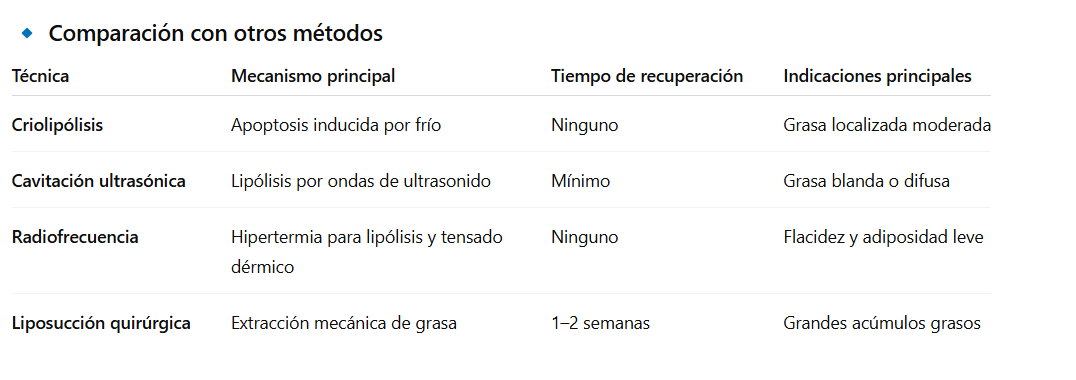 reducción no invasiva del tejido adiposo subcutáneo, con una disminución media del 20–27% del espesor graso por sesión.