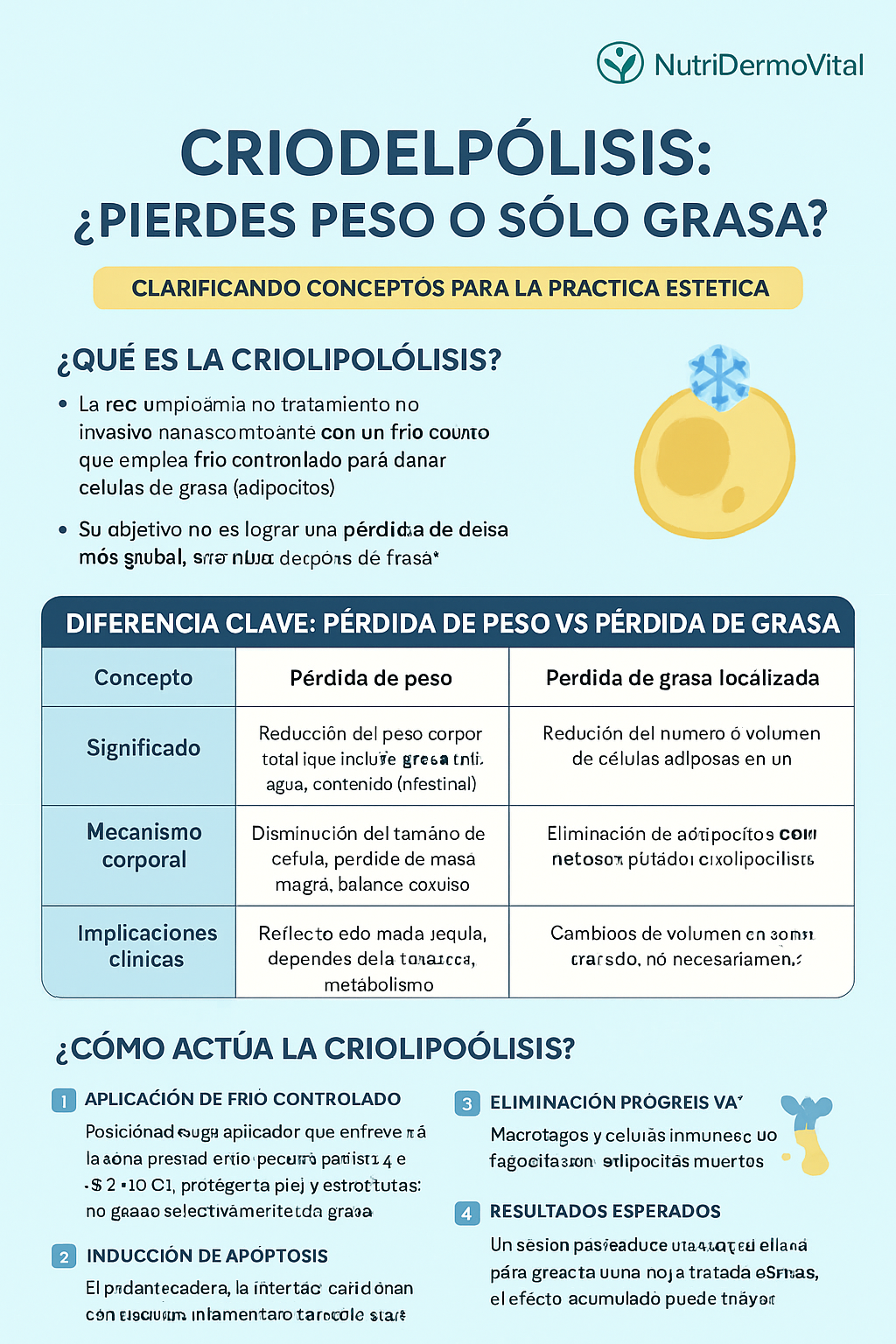- En la práctica clínica con criolipólisis, los resultados de reducción de volumen o de perímetro (mediciones con cinta métrica) son visualmente más sensibles que el peso total corporal.