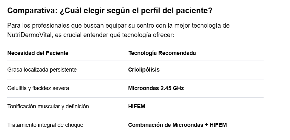 Desde NutriDermoVital, líderes en formación y aparatología médico-estética, analizamos las tres tecnologías que están dominando el mercado y las búsquedas en Google este año: la Criolipólisis, las Microondas de 2.45 GHz y el Electromagnetismo de Alta Intensidad (HIFEM).
