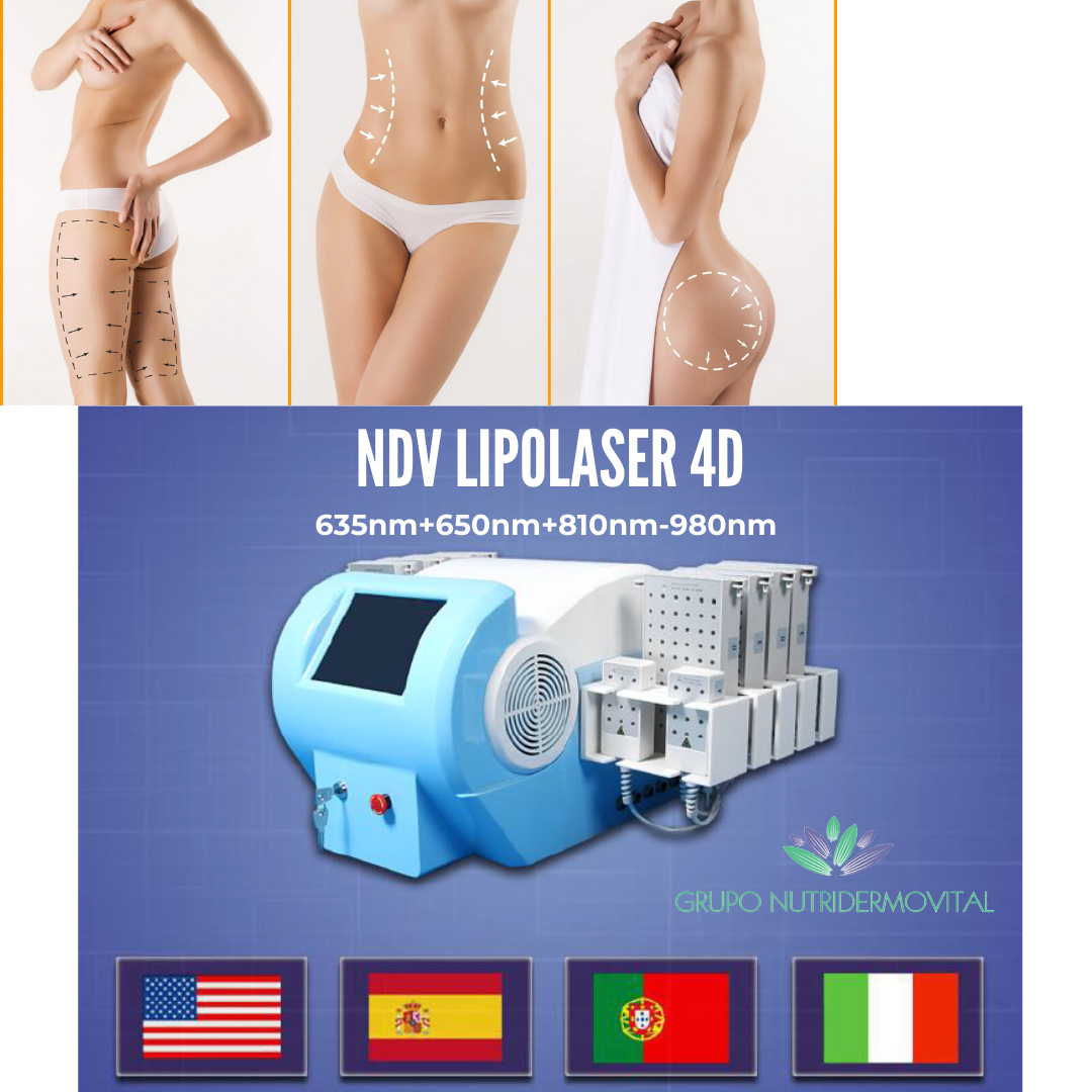 NDV LIPOLÁSER 4D emits low levels of laser energy, which creates a chemical signal in fat cells, breaks down stored triglycerides into free fatty acids and glycerol, which are released through channels in cell membranes. Fatty acids and glycerol are transported around the body to tissues that will use them during metabolism to create energy. This process of releasing fatty acids is a natural response when the body needs to use stored energy reserves, therefore, NDV LIPOLÁSER 4D does not create any unnatural reaction in the body, it does not affect or damage the surrounding structures, such as the skin, the blood vessels and peripheral nerves. It is a non-invasive device, it does not cause pain, it is used in treatments to reduce body fat, it uses the energy of the diode laser in its different wavelengths, which destroy said fat cell. It provides fast results, which are shown immediately after the first treatment and during the course of treatments.