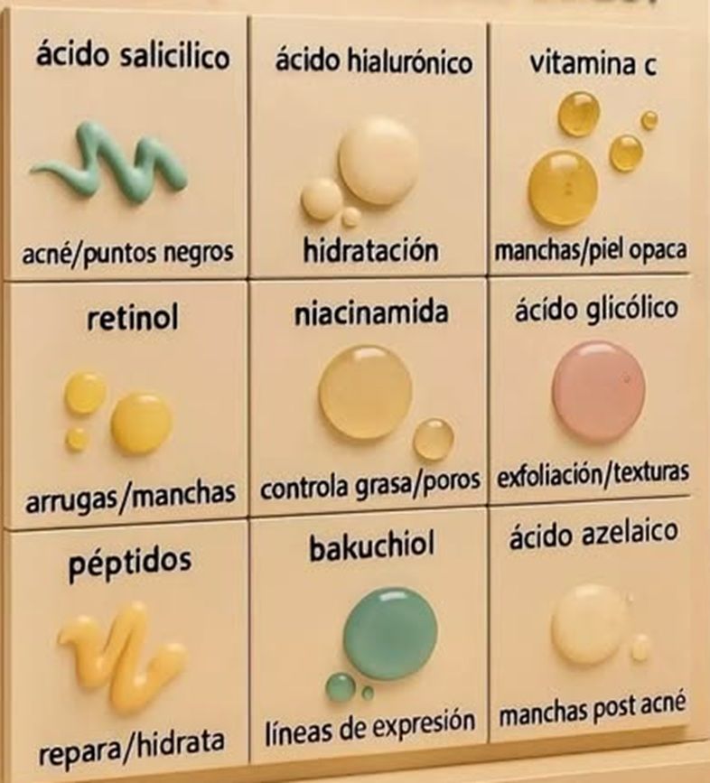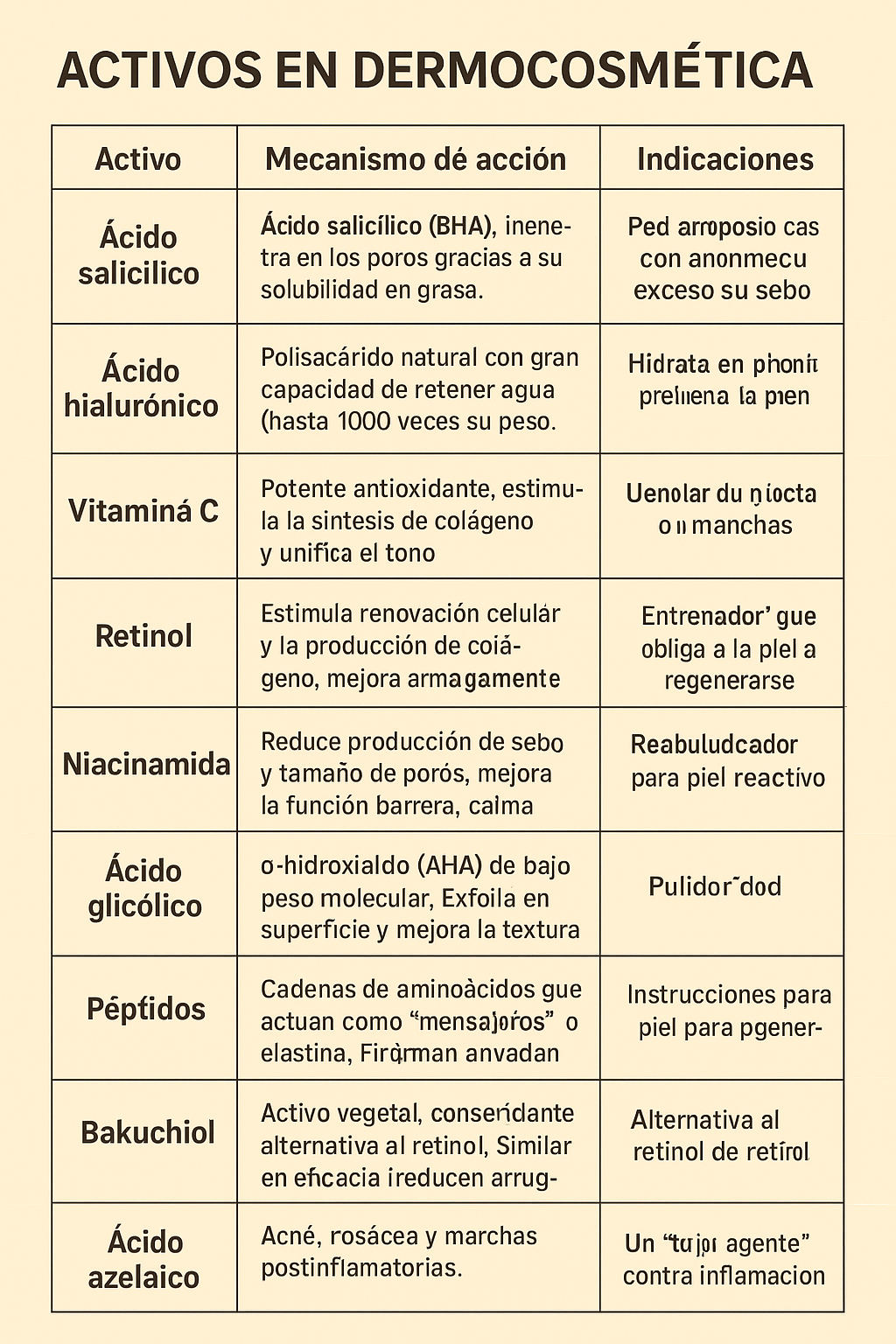 En estética profesional es fundamental conocer los principales activos cosméticos y cómo actúan sobre la piel. Esta guía didáctica resume los más utilizados, con base científica y ejemplos comparativos para facilitar el aprendizaje.