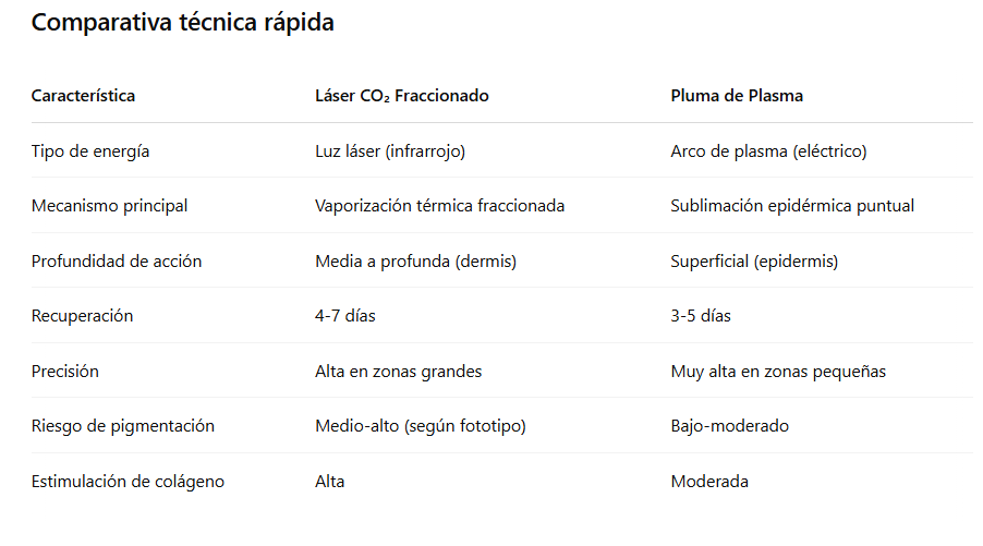 Ambas tecnologías son valiosas en manos expertas. El láser CO₂ fraccionado es más potente y versátil para rejuvenecimientos profundos, mientras que la pluma de plasma ofrece una alternativa eficaz y precisa en zonas pequeñas y tratamientos superficiales.