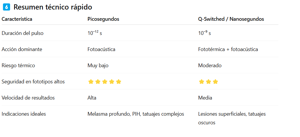 📌 Conclusión: Cuanto más corto es el pulso, más se privilegia la acción mecánica sobre el pigmento y menor es el daño térmico colateral.