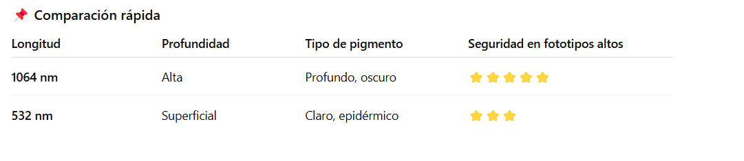 - Menor absorción por melanina → más seguro en fototipos III-VI