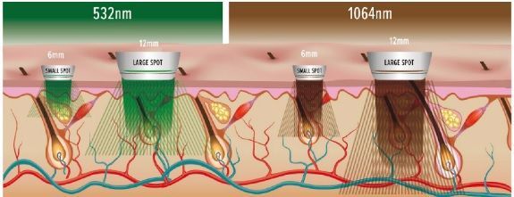 1064 nm además de 532 nm, que tiene la capacidad de tratar el marrón y el rojo simultáneamente con una mejor absorción que otras longitudes de onda «vasculares».
