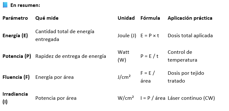 📍 Ejemplo: Un láser que emite 10 J sobre un área de 2 cm² tiene una fluencia de 5 J/cm².