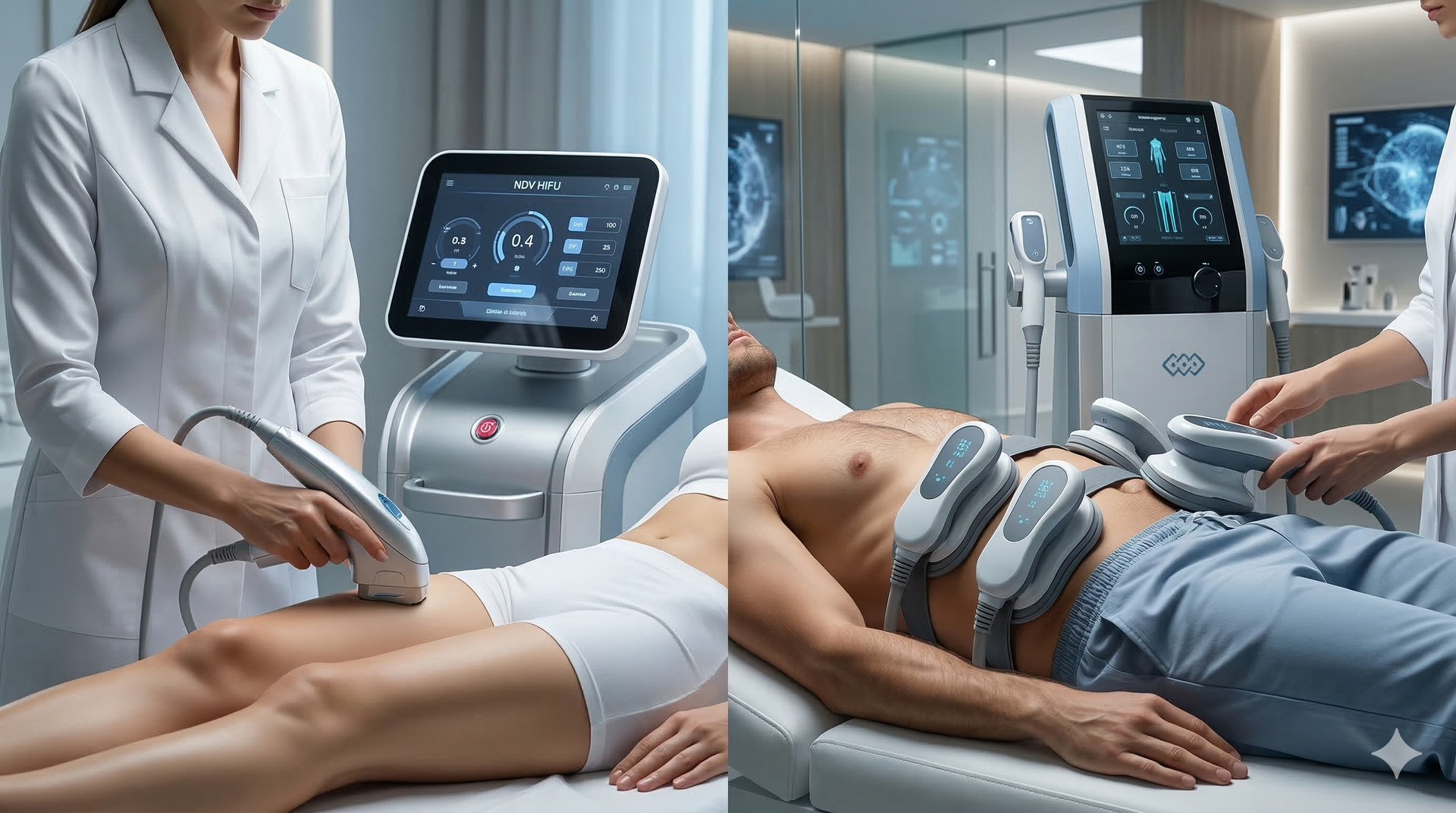 El tratamiento con Ultrasonidos Focalizados de Alta Intensidad (HIFU) en hombres requiere un abordaje específico. La piel masculina es , de media, un 25% más gruesa y posee una mayor densidad de colágeno y glándulas sebáceas. El sistema HIFU 25D permite una focalización precisa para trabajar sobre el SMAS (Sistema Musculoaponeurótico Superficial) y el tejido adiposo subcutáneo con máxima eficacia. Protocolo de Aplicación Profesional 1. Fase de Diagnóstico: Evaluar el grosor de la dermis y el grado de laxitud. En hombres, el foco principal suele ser la definición de la línea mandibular y la reducción de grasa localizada (papada o abdomen). 2. Preparación: Limpieza profunda (especial atención si hay foliculitis por afeitado) y aplicación de gel conductor ultrasónico de alta viscosidad. 3. Ejecución Facial (Marcaje): * Evitar la zona de la tiroides y trayectos nerviosos (nervio facial). Realizar disparos vectorizados hacia los ganglios preauriculares para potenciar el efecto lifting. 4. Ejecución Corporal: Uso de cartuchos de mayor profundidad para la ruptura de adipocitos (Lipólisis ultrasónica).