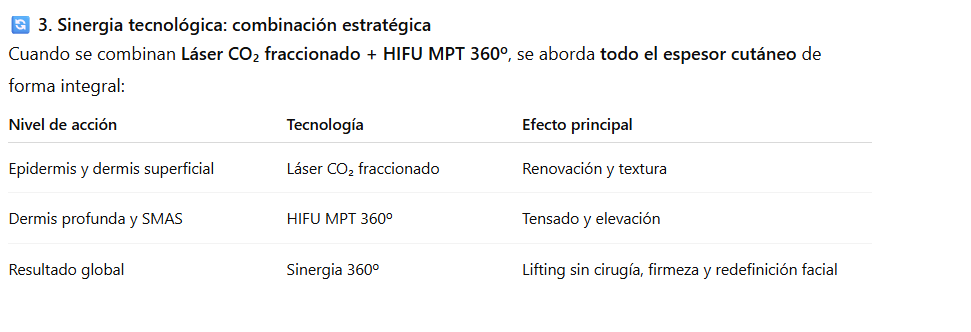 - Se recomienda aplicar HIFU MPT 360º primero, y realizar el láser CO₂ fraccionado a las 3–4 semanas, una vez recuperada la piel.