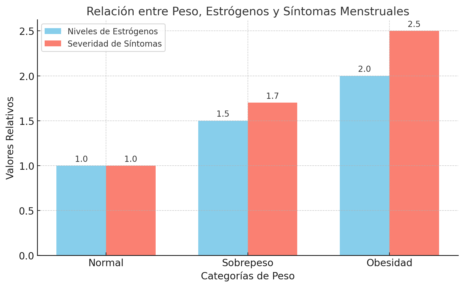 Aquí tienes un gráfico que ilustra la relación entre las categorías de peso, los niveles de estrógenos y la severidad de los síntomas menstruales: