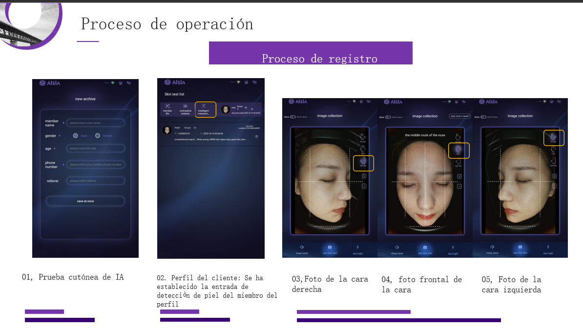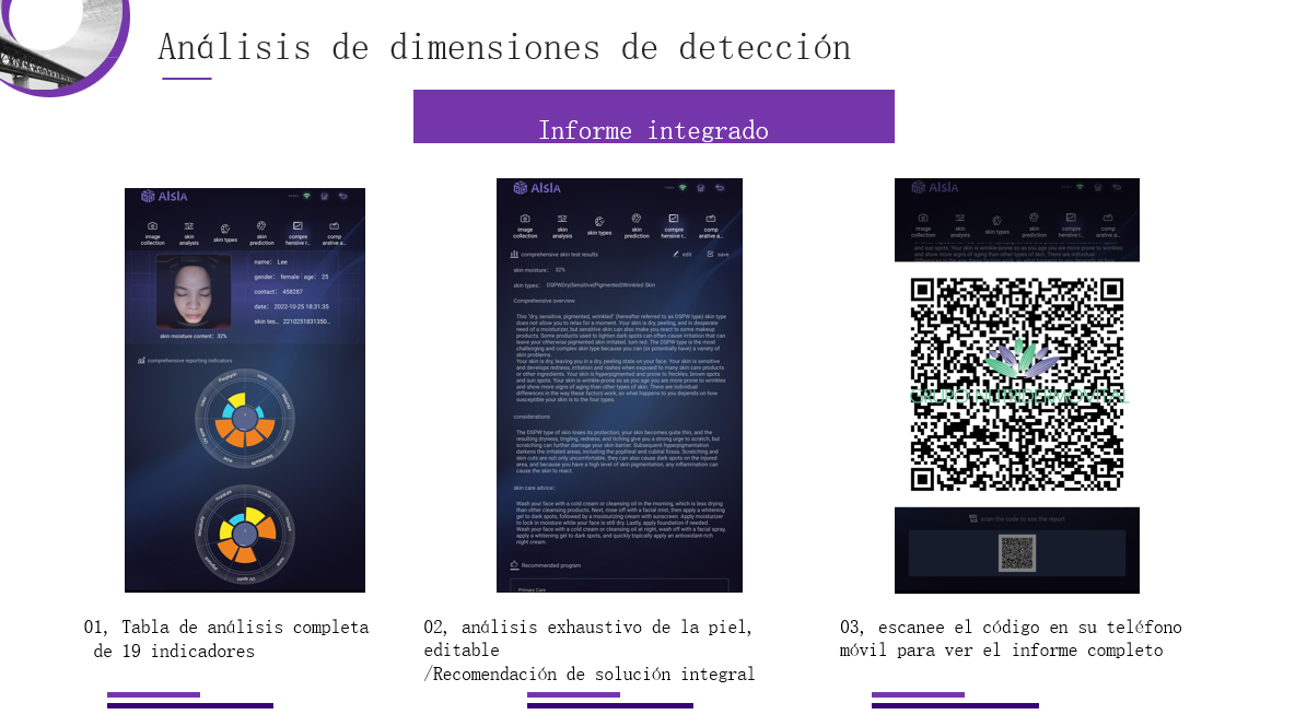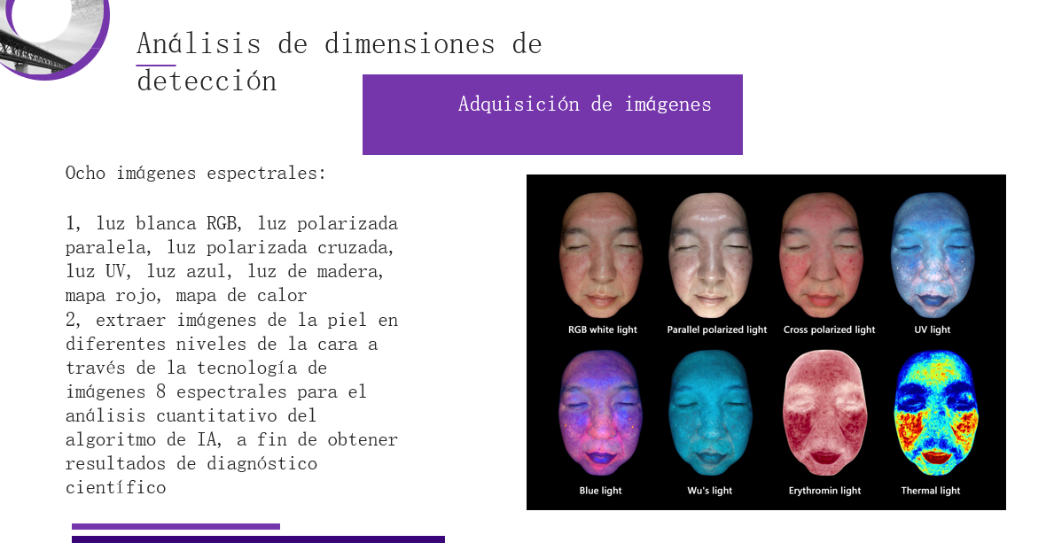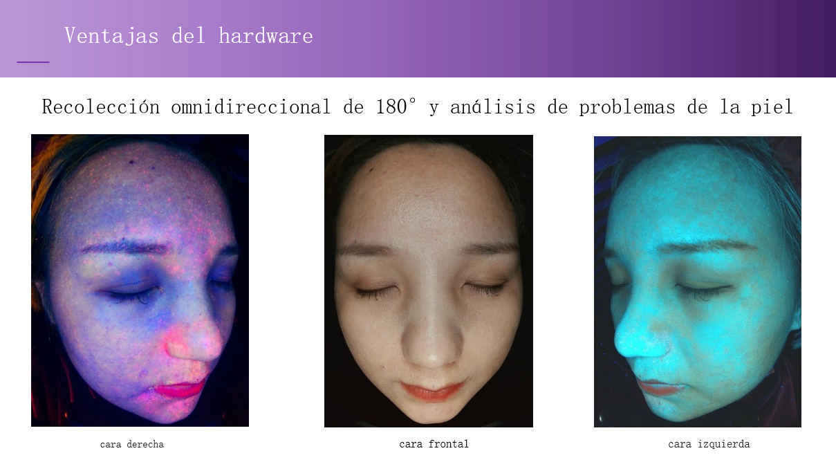 Puede evaluar cuantitativamente la pigmentación de la piel, los poros, las arrugas, la llanura, la porfirina, las manchas UV y el daño solar.