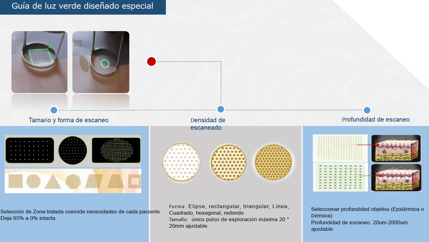 NDV CO2 L6SER FRACCIONADO actúa de forma selectiva y localizada, entregando la energía en un frente de temperatura, controlada y suficiente, para producir el daño confinado a columnas (Técnica de Columna) de piel que cicatrizan rápidamente, dejando zonas de colágeno nuevo que conlleva una mejora del tono y la textura de la cicatriz, suavizándole, mejorando así el aspecto final de la zona tratada.