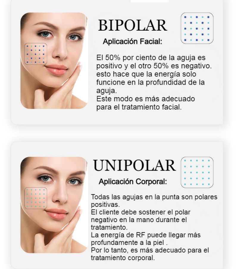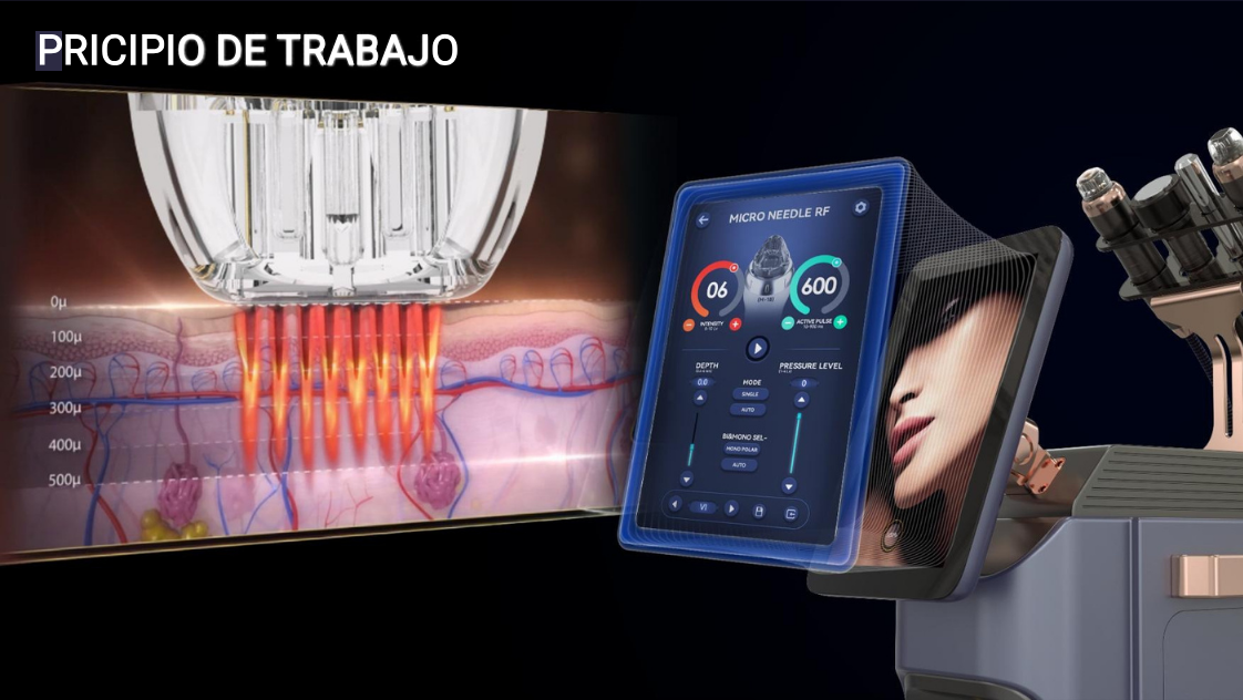 La energía de la radiofrecuencia es emitida a través de las microagujas para llegar a la capa de la dermis, calentar la piel y estimular la proliferación de colágeno, para promover la reorganización de las fibras elásticas, lograr el efecto de estiramiento de la piel y eliminación de arrugas.