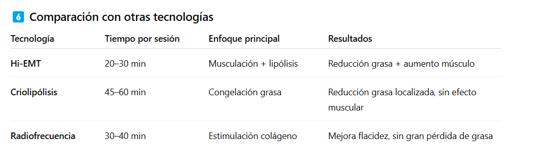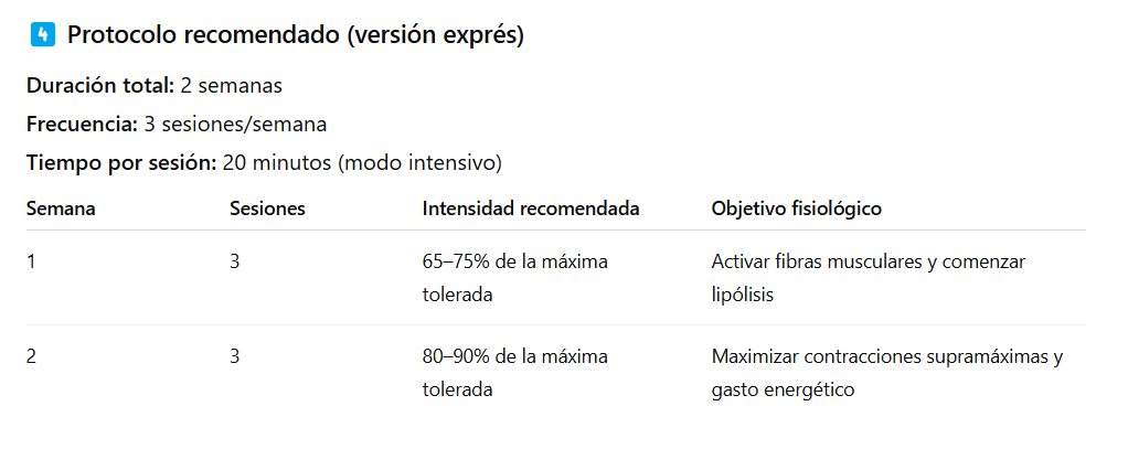 💡 Conclusión: El protocolo Hi-EMT exprés es una estrategia eficaz para mujeres de 50 años que desean reducir grasa abdominal y mejorar el tono muscular en poco tiempo, siempre que se combine con hábitos saludables y se personalice según la tolerancia y condición física.