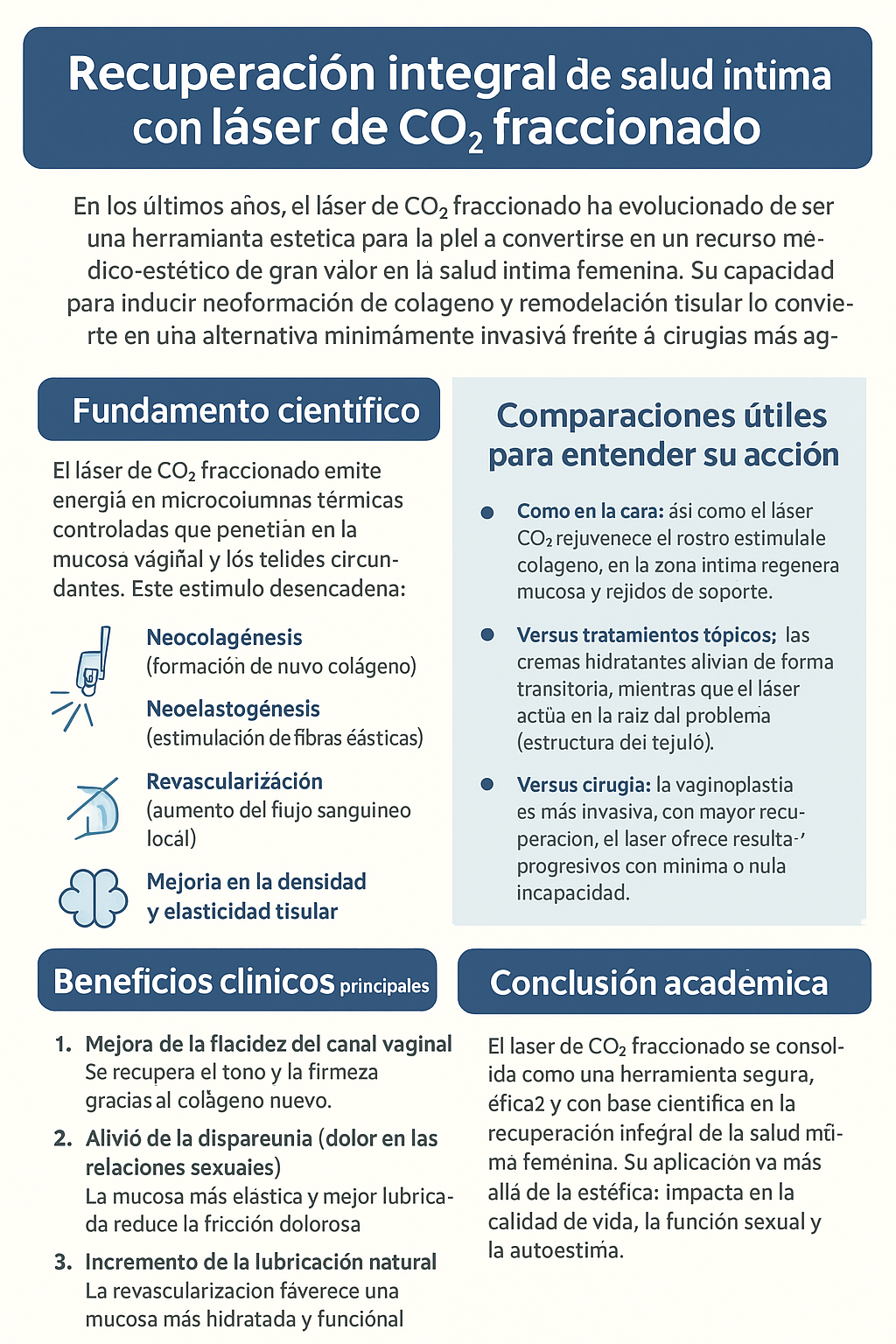 El láser de CO₂ fraccionado se consolida como una herramienta segura, eficaz y con base científica en la recuperación integral de la salud íntima femenina. Su aplicación va más allá de la estética: impacta en la calidad de vida, la función sexual y la autoestima.