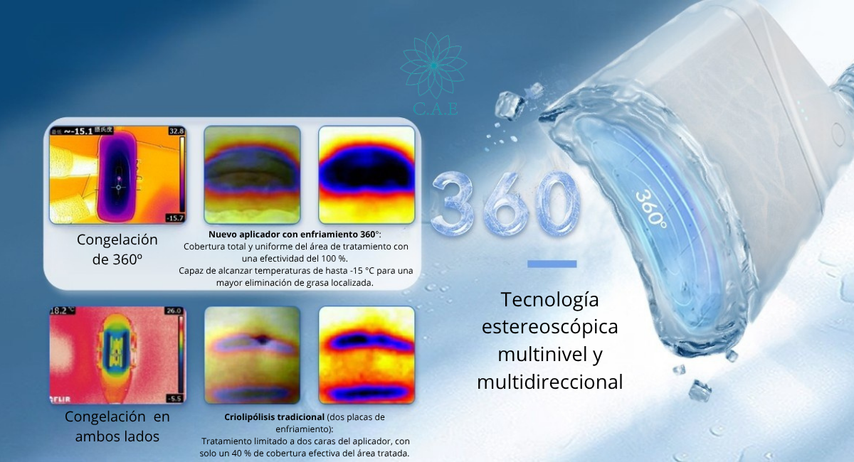Mediante la combinación de enfriamiento y succión, la tecnología 360° congela de manera precisa las células grasas subcutáneas, asegurando su destrucción sin dañar los tejidos circundantes.