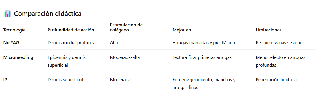 - Limitaciones: menor penetración que el Nd:YAG, más indicado en arrugas finas y daño solar leve.