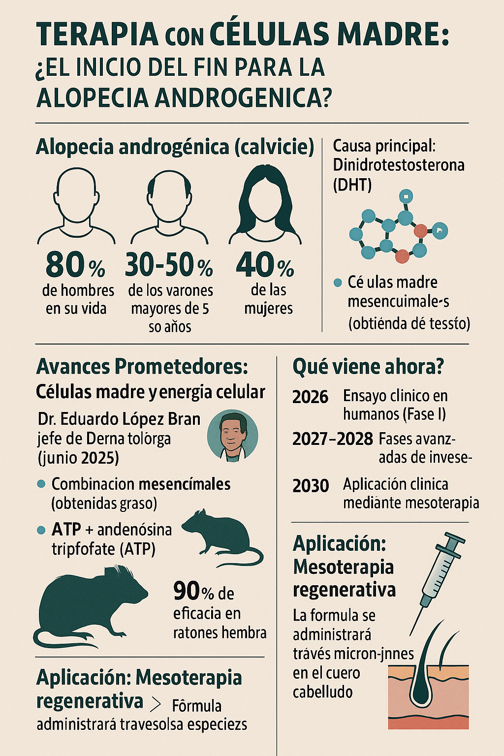 - 2030 (estimado): Si se superan los requisitos de seguridad y eficacia exigidos por las agencias reguladoras, se podría aplicar clínicamente mediante mesoterapia capilar.