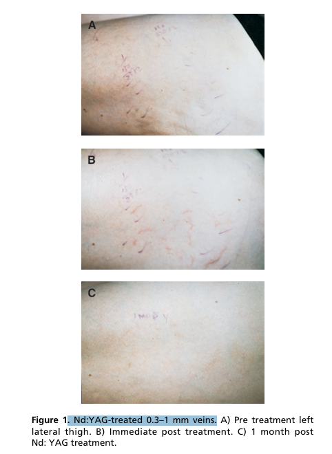 ._. El láser Nd:YAG de 1064 nm equipado con criógeno fue notablemente eficaz y seguro para el tratamiento de las venas de las piernas de 0,3-3 mm. El uso de anestesia tópica puede ser necesario para algunos pacientes.