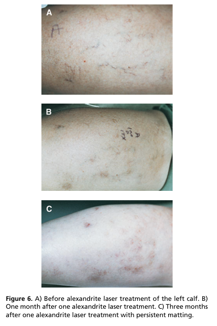 ._. El láser de alejandrita de 3 mseg y 755 nm con fluencias de 60-70 J/cm2 y un punto de 8 mm puede ser eficaz, pero la respuesta inflamatoria, la púrpura y el enmarañamiento limitan su utilidad.