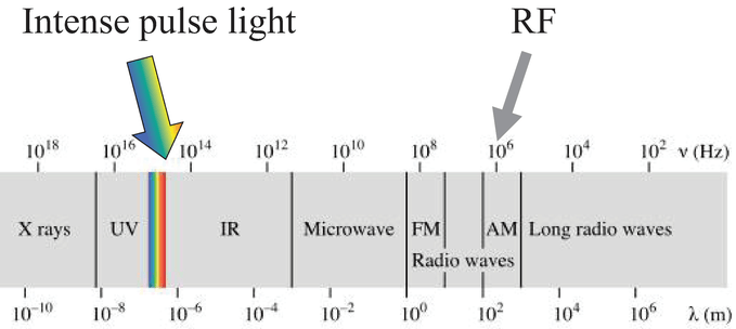 La RF es una parte del espectro electromagnético. La RF puede inducir efectos térmicos en el tejido profundo, mientras que la luz pulsada intensa IPL no ablativa solo alcanza la dermis superficial, que no es clínicamente suficiente para tratar la laxitud