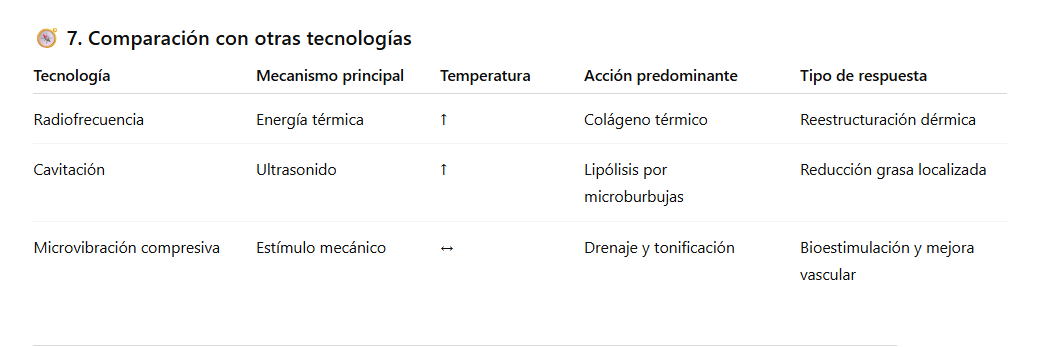 - Estimulación mecánica del tejido conectivo → reordenamiento de septos fibrosos (efecto anticelulítico).