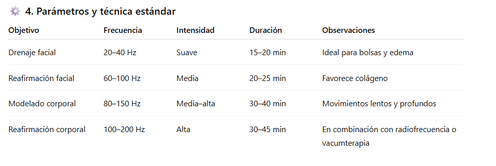 20 y 200 Hz, ajustándose según el objetivo (drenante, reafirmante o tonificante).